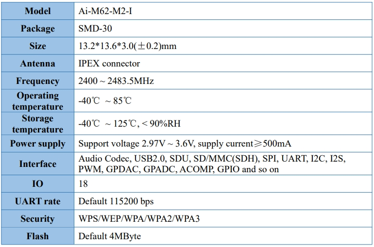 Ai-M62-M2-I module has rich peripheral interfaces, including USB2.0, SDU, SD/MMC (SDH), SPI, UART, I2C, I2S, PWM, GPDAC, GPADC, ACOMP, GPIO, etc. Whether you’re developing IoT solutions, smart home devices, or wearable electronics, the Ai-M62-M2-I module offers the performance and flexibility you need to bring your ideas to life.